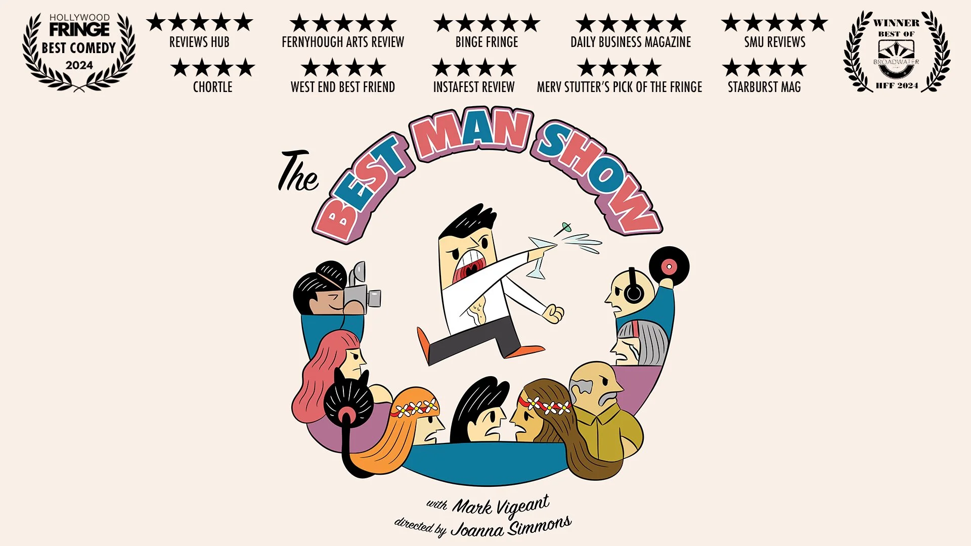The Best Man Show is an interactive and darkly hilarious wedding reception where Mark Vigeant plays the Groom’s brother Paul, who has been asked to give the toast at an untraditional polyamorous commitment ceremony. It starts out fun and silly, with your typical masculine roasting and ribbing – and gradually devolves into a drunken chaotic mess where Paul tries to understand what it means to love, but can’t get over his own toxic masculinity to recognize his loneliness. Throughout the show, Mark recruits audience members to play various wedding guests.